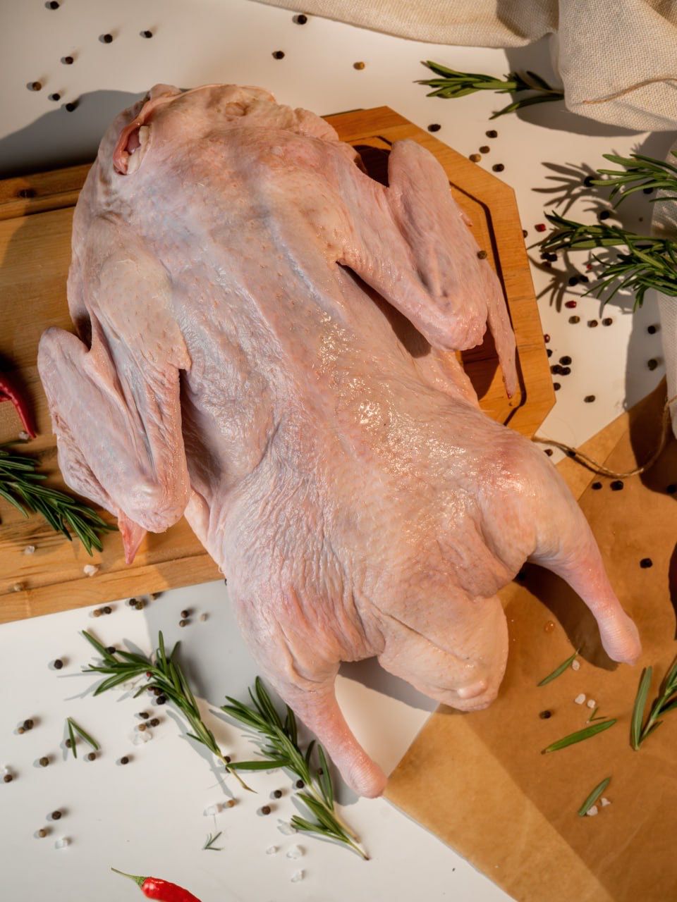 Свежее мясо гуся с нежным и сочным мясом, идеально для запекания.